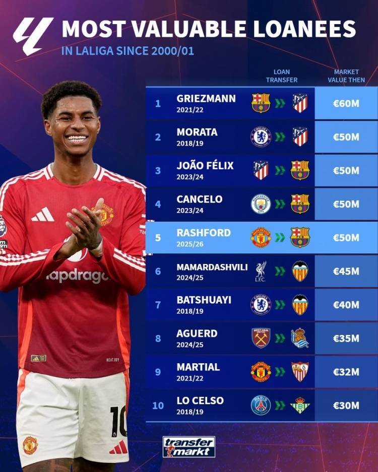 本世纪西甲租将德转身价榜:格子居首,拉什福德5000万欧并列次席